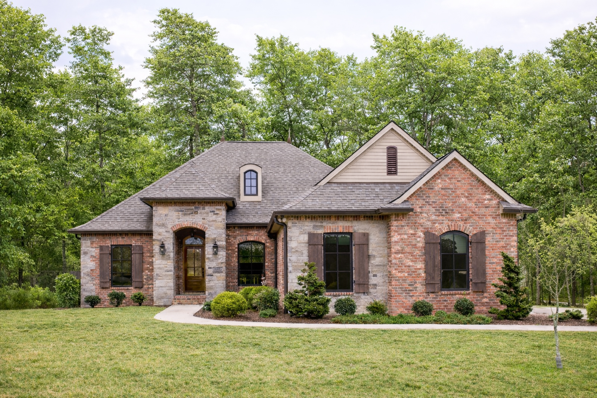 The Laurel Brooke exterior design gracefully combines stone and brick detailing to deliver charming French Country appeal.